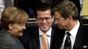 Başbakan Angela Merkel, Pazartesi günü, muhafazakâr koalisyonda yükselen bir yıldız olarak görülen savunma bakanının yanında olduğunu açıkladı.