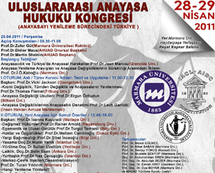 Anayasa Hukuku Araştırmaları ve İncelemeleri Derneği başkanı Prof.Dr. İbrahim Kaboğlu’nun öncülüğünde 28-29 Nisan 2011 tarihlerinde Marmara Üniversitesi Haydarpaşa Yerleşkesi’nde gerçekleştirilecek olan Uluslararası Anayasa Hukuku Kongresi’nin programı belli oldu. Yurtiçi ve yurtdışından çok sayıda saygın Anayasa hukukçusunun katılımıyla gerçekleştirilecek olan Kongre’nin Türkiye’deki Anayasa hukuku çalışmalarına gerçek bir katkı yapacağını düşünüyorum.