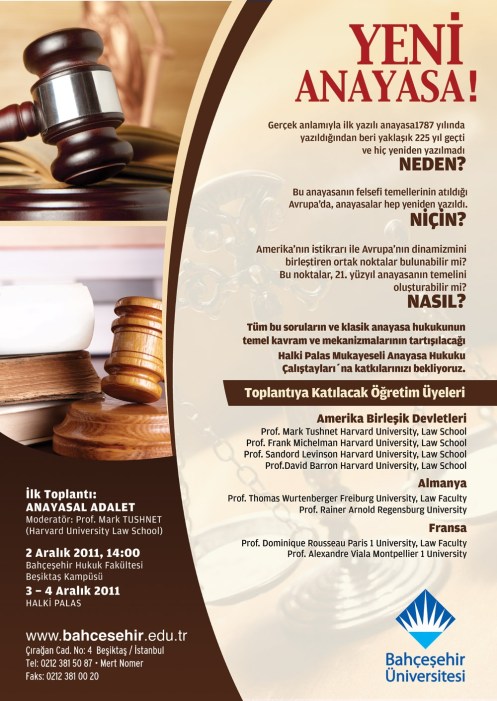 Bahçeşehir Üniversitesi Hukuk Fakültesi Anayasa Hukuku Anabilim Dalı olarak bir süredir hazırlık çalışmalarını yürüttüğümüz “Yeni Anayasa” toplantılarının ilk bölümü 2-4 Aralık tarihleri arasında düzenlenecek. 2 Aralık Cuma günü 14.00’te Beşiktaş’taki kampüste Harvard Üniversitesi’nden Prof. Mark Tushnet’in yöneteceği oturumun ardından toplantılar hafta sonunda Heybeliada’daki Halki Palas’ta devam edecek.