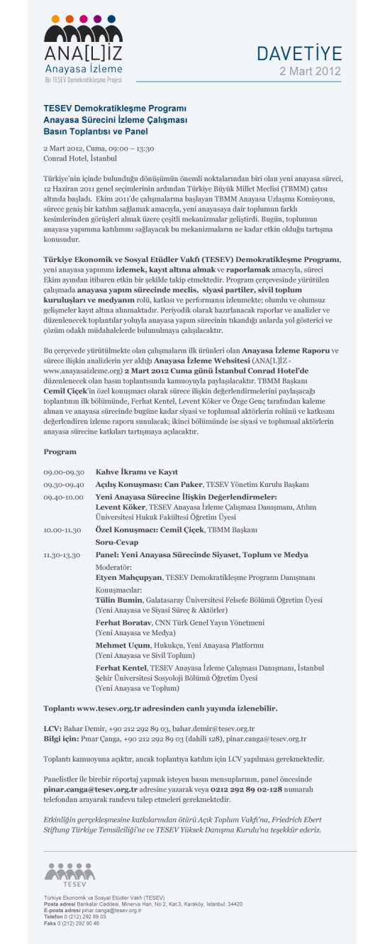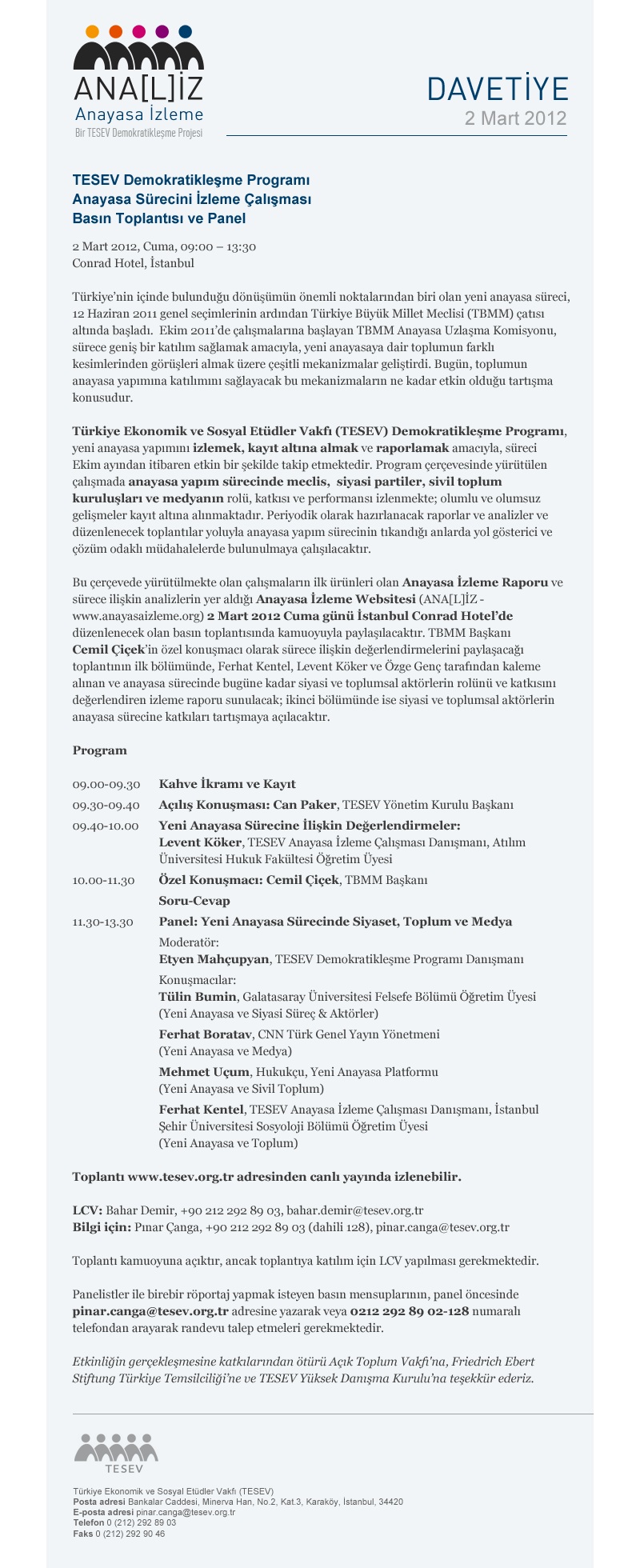Türkiye Ekonomik ve Sosyal Etüdler Vakfı (TESEV) 2 Mart 2012 Cuma günü Conrad Otel’de düzenleyeceği basın toplantısıyla Demokrasi Programı çerçevesinde Anayasa yazım süreciyle ilgili hazırladığı ilk raporu kamuoyuyla paylaşacak. Atılım Üniversitesi’nden Prof.Dr. Levent Köker‘in sunumunu yapacağı değerlendirme raporunun ardından panel oturumuna geçilecek.