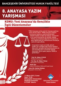 Bahçeşehir Üniversitesi Hukuk Fakültesi bünyesinde düzenlenen 8. Anayasa Yazım Yarışması 11 Mayıs Cuma günü üniversitenin Beşiktaş Kampüsü’nde gerçekleşecek. Yeni bir Anayasa yazım sürecine girildiği için sonuncusu yapılacak olan yarışmanın bu seferki konusu “Yeni Anayasa’da Gençlikle İlgili Düzenlemeler”.