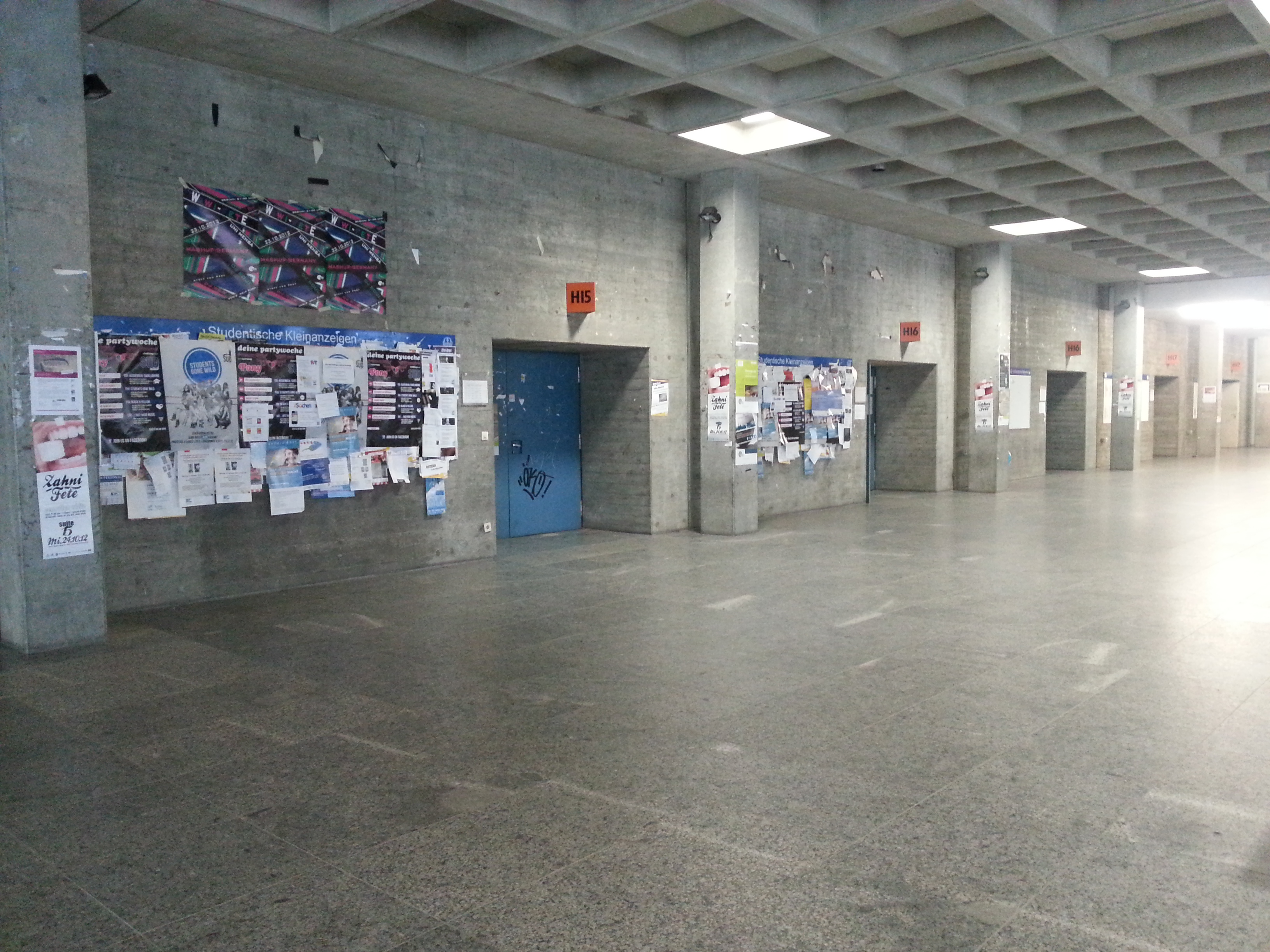 kullanılmamış ancak son derece temiz. Öğrenciler afişlerini ilan panolarına ve bina kapılarına asıyor. Belirtmeye gerek yok, herhangi bir afiş denetimi söz konusu değil elbette. Bir etkinlik yapılıyorsa genelde kumaşa boyanmış büyük bir pankart en işlek yere asılmış oluyor. Öğrenciler kendi pankartlarını kaldırmadığı sürece kimse dokunmuyor.