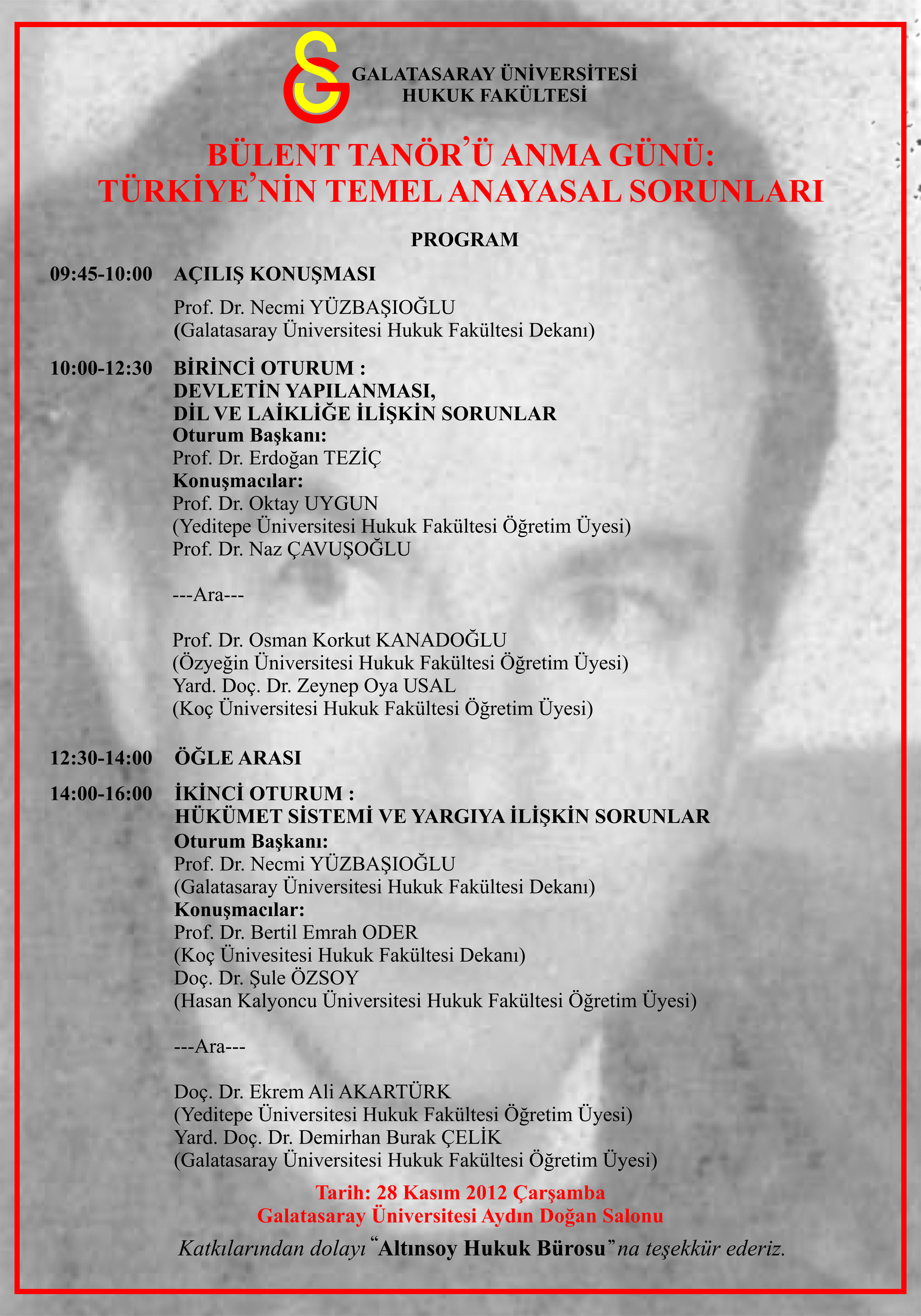Galatasaray Üniversitesi Hukuk Fakültesi 28 Kasım 2012 Çarşamba günü büyük hukukçu, aydın kişi, anayasa hukuku tarihimizin aydınlık yüzü Prof.Dr. Bülent Tanör anısına Türkiye’nin Temel Sorunları adıyla bir sempozyum düzenliyor. Üniversite’nin Ortaköy’deki kampüsünde Aydın Doğan Salonu’nda gerçekleşecek sempozyum 9.45’te başlayıp 16.00’ya kadar sürecek.
