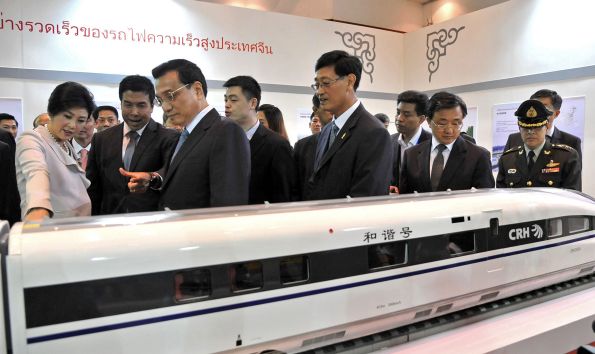 In this handout photo taken on October 12, 2013 shows Thai Prime Minister Yingluck Shinawatra (L) talks with Chinese Premier Li Keqiang during an exhibition of high-speed railways at Queen Sirikit hall in Bangkok on October 12, 2013. Li is on three-day visit. AFP PHOTO / GOVERNMENT HOUSE —-EDITORS NOTE —-RESTRICTED TO EDITORIAL USE MANDATORY CREDIT ” AFP PHOTO / Thai Government House ” NO MARKETING NO ADVERTISING CAMPAIGNS – DISTRIBUTED AS A SERVICE TO CLIENTS