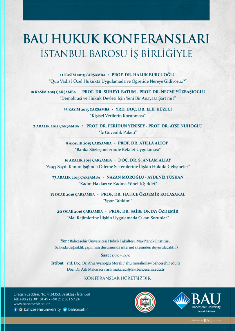 Bahçeşehir Üniversitesi Hukuk Fakültesi’nin İstanbul Barosu’nun işbirliği ile gerçekleştireceği konferanslar 11 Kasım Çarşamba günü Prof.Dr Haluk Burcuoğlu’nun özel hukuk konferansıyla başlıyor. 18 Kasım’da ise, milletvekilliğinin ardından BAU Hukuk Fakültesi’ne geri dönen Prof.Dr Süheyl Batum’un yeni anayasanın gerekliliğini tartışacağı oturumun yapılacak. Konferanslar serisinin ilerleyen haftalarında da İç Güvenlik Paketi ve kadın hakları gibi anayasa hukukunu ilgilendiren oturumlar bulunuyor.